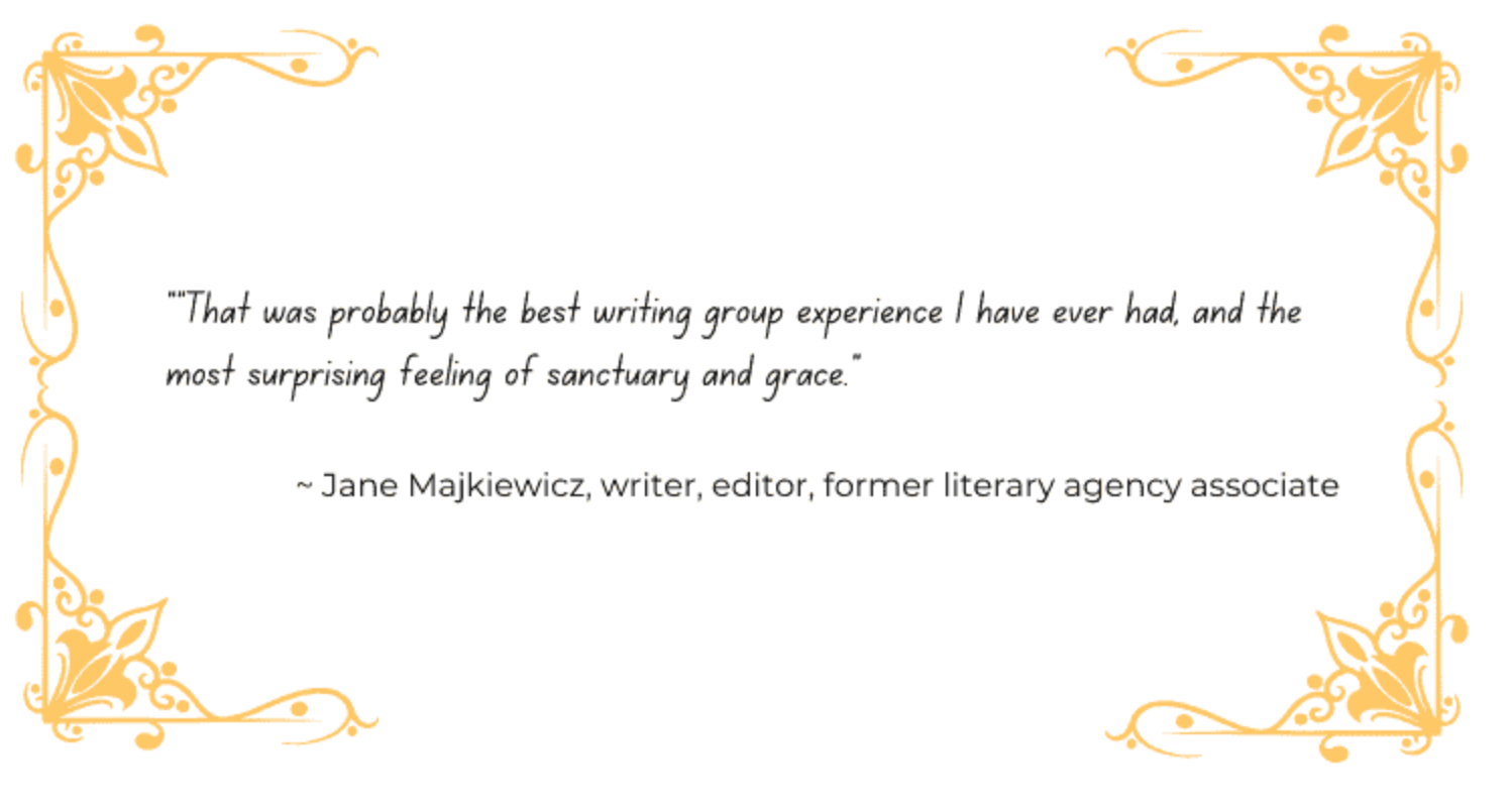 “That was probably the best writing group experience I have ever had, and the most surprising feeling of sanctuary and grace.” — Jane Majkiewicz